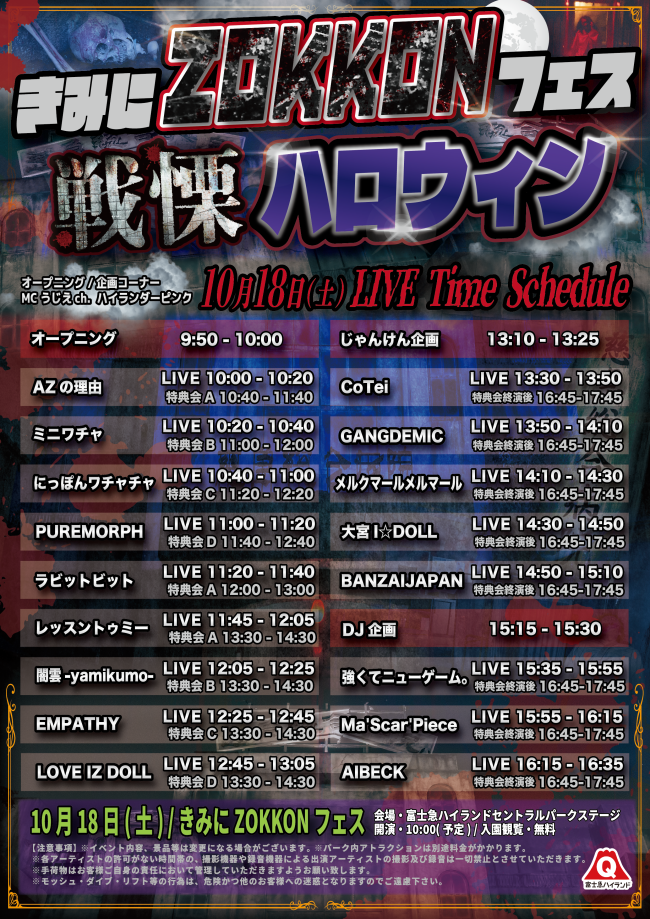 総勢17組のアイドルたちが富士急ハイランドに大集結!今回は、ハロウィン特別企画として、富士急ハイランドの公式ユニフォームを着用したアイドルたちがステージに登場するほか、色鮮やかな光をまとった「LEDジェットスモーク」によるダイナミックな演出で、富士急のハロウィンシーズンを盛り上げる!