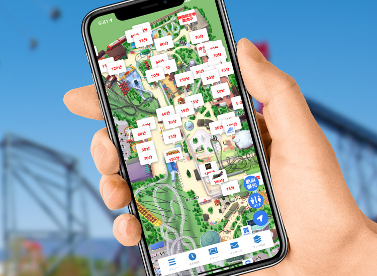 各アトラクションの待ち時間をリアルタイムでチェックできます。また、当日の「絶叫優先券」の販売状況の確認と指定利用時間30分前までの購入もアプリ上でできるため、その日の状況を見ながら混雑回避のために優先券を上手く活用する事ができます。 -