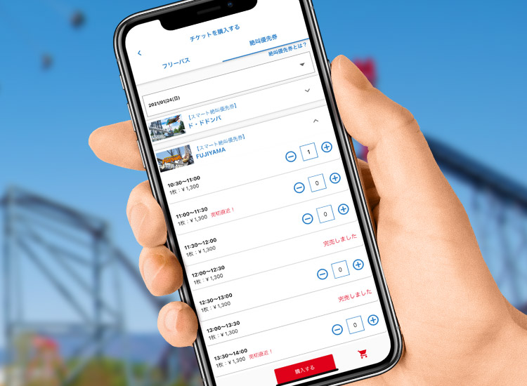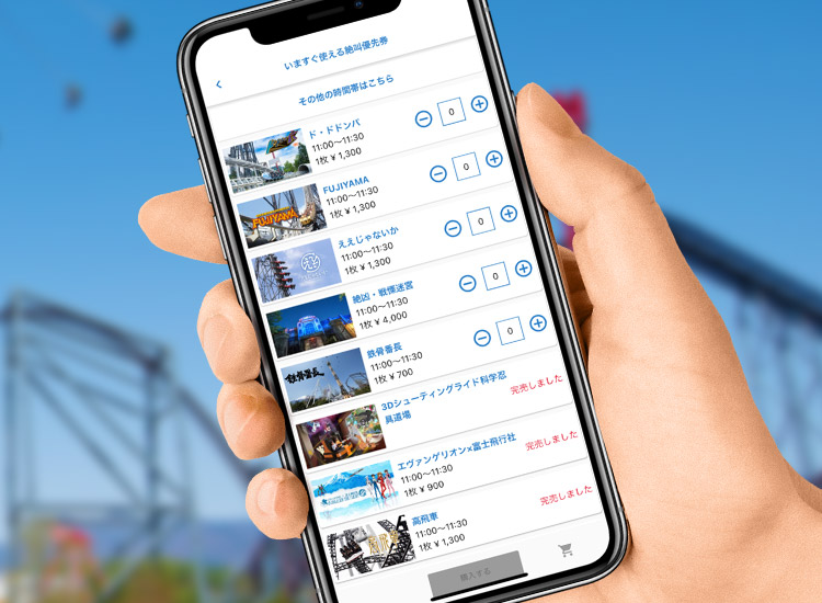 人気機種に待たずに乗れる優先券の購入など、