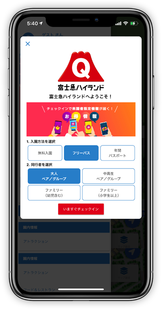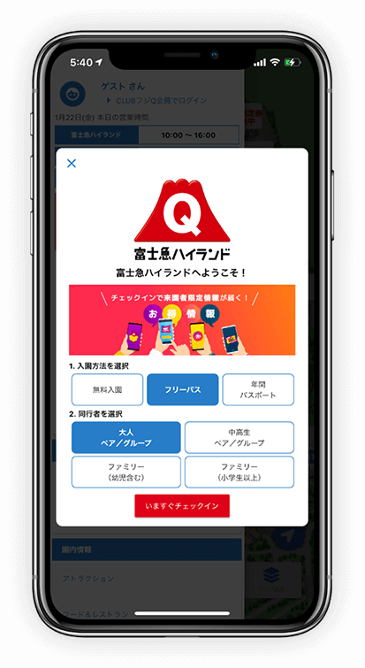- 来園中にアプリ会員限定の情報や特典が受け取れる『チェックイン機能』