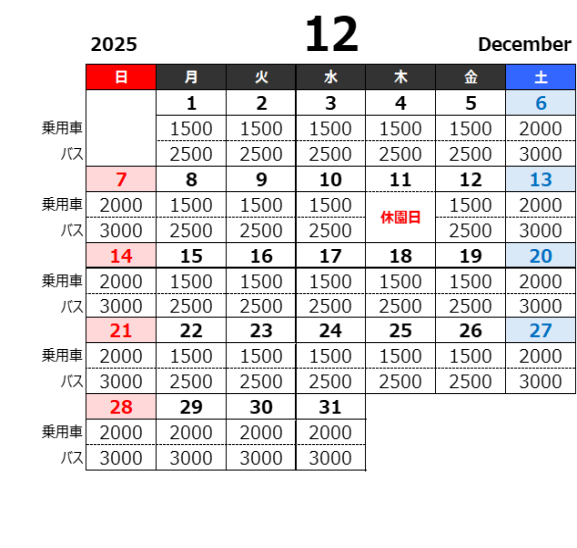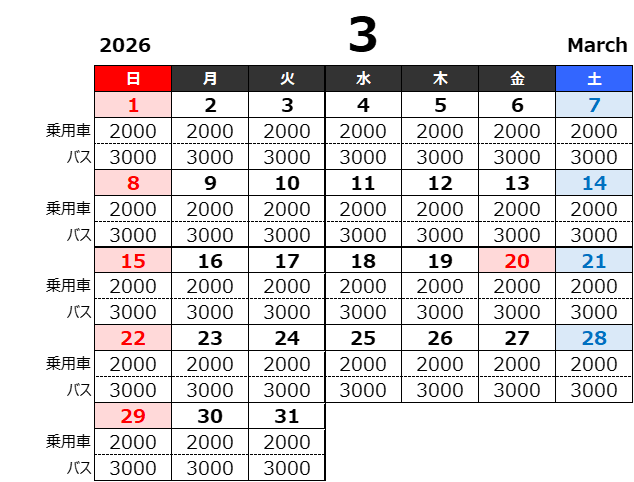 ご利用日により、料金が異なりますので以下の料金表をご確認ください。