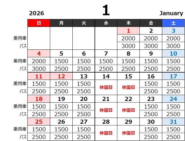 ご利用日により、料金が異なりますので以下の料金表をご確認ください。